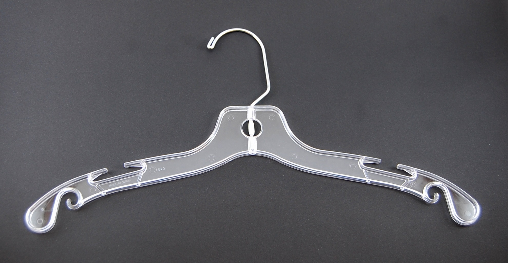 • CLEAR PLASTIC • CHROME SWIVEL HOOK • NOTCHED SHOULDERS • BOX OF 100 HANGERS