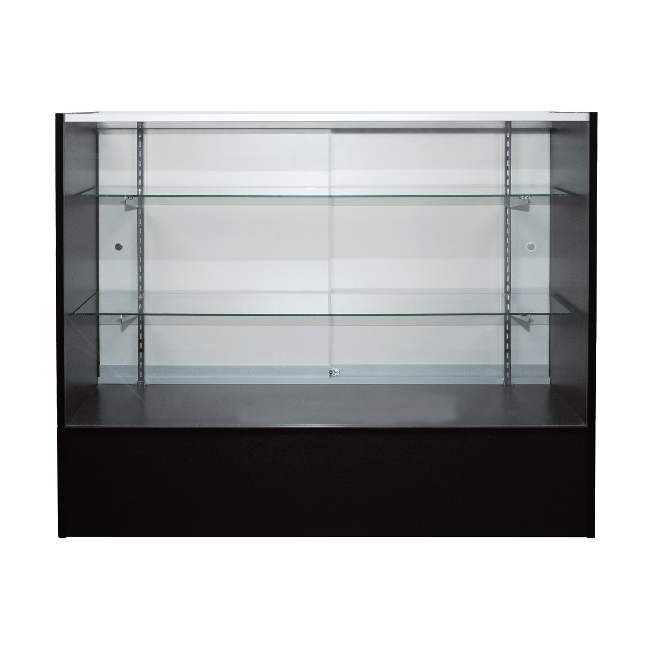 • DURABLE MELAMINE LAMINATE SURFACE • ALL TEMPERED SAFETY GLASS • 28″ H FRONT VIEWING AREA • ADJUSTABLE 8″ AND 10″ GLASS SHELVES • STAIN FINISHED CLEAR ANODIZED ALUMINUM FRAME EXTRUSION • CHROME FINISHED STANDARD AND BRACKET • BRIGHT WHITE FINISHED HARDBOARD SLIDING DOORS 48″L X 18″W X 38″H