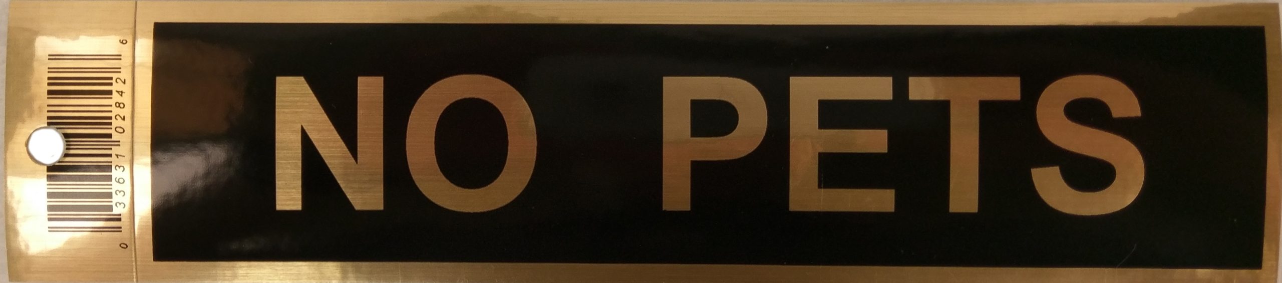 “NO PETS” • 2″ X 8″ SIGN WITH ADHESIVE BACK • FOR USE WITH FLAT SURFACES • COLOR BLACK/GOLD
