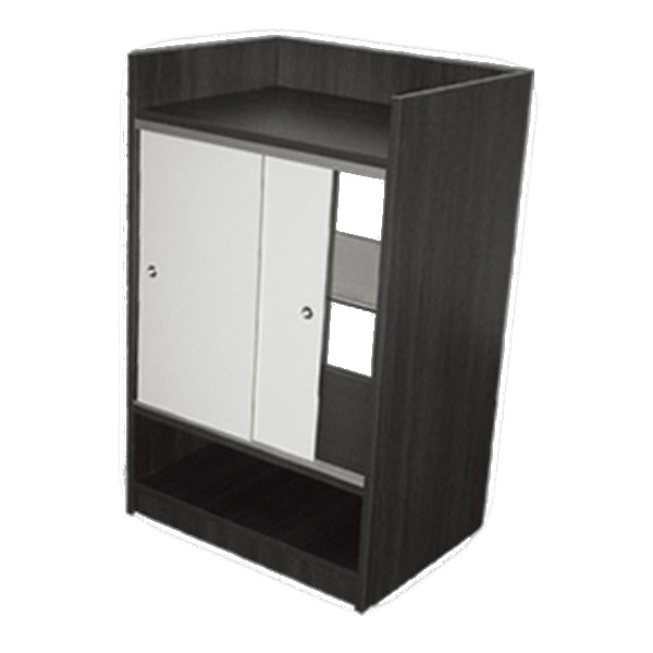 • DURABLE MELAMINE LAMINATE SURFACE • 24″ H GLASS FRONT DISPLAY AREA • ONE 15″ ADJUSTABLE GLASS SHELF • BRIGHT WHITE REAR ACCESS SLIDING DOORS • REAR 6″ STORAGE CABIN 24″L X 18″W X 38″H