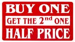 • “BUY ONE GET THE 2ND ONE HALF PRICE” • 7″ X 11″ PLASTIC RETAIL SIGN • RED AND WHITE COLORS