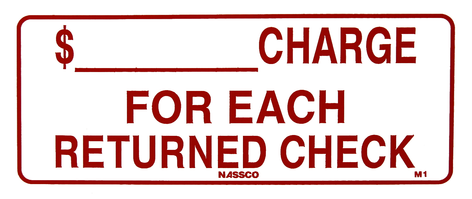 • “$_______ CHARGE FOR EACH RETURNED CHECK” • 4″ X 8-3/4″ PLASTIC RETAIL SIGN • RED AND WHITE COLORS