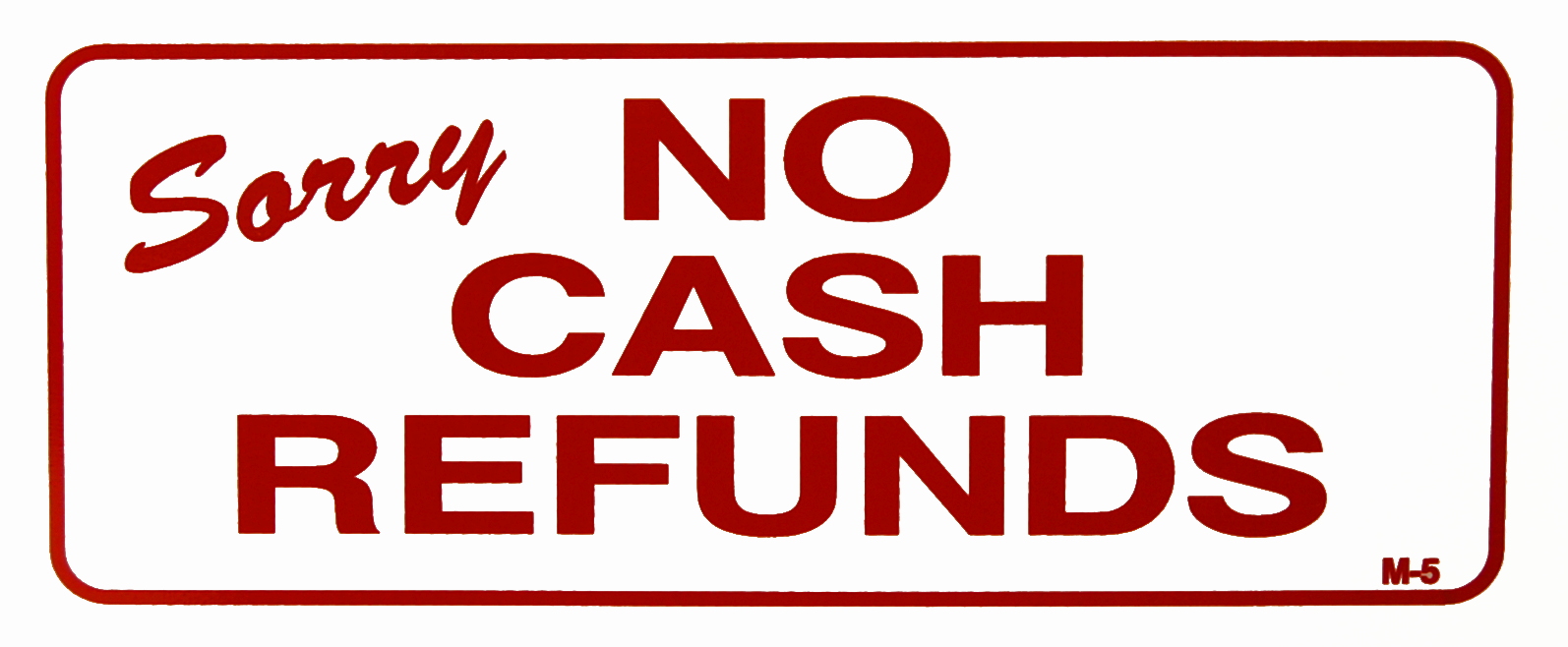 SKU#M-5 “SORRY NO CASH REFUNDS” – 4″ X 8-3/4″ PLASTIC RETAIL SIGN