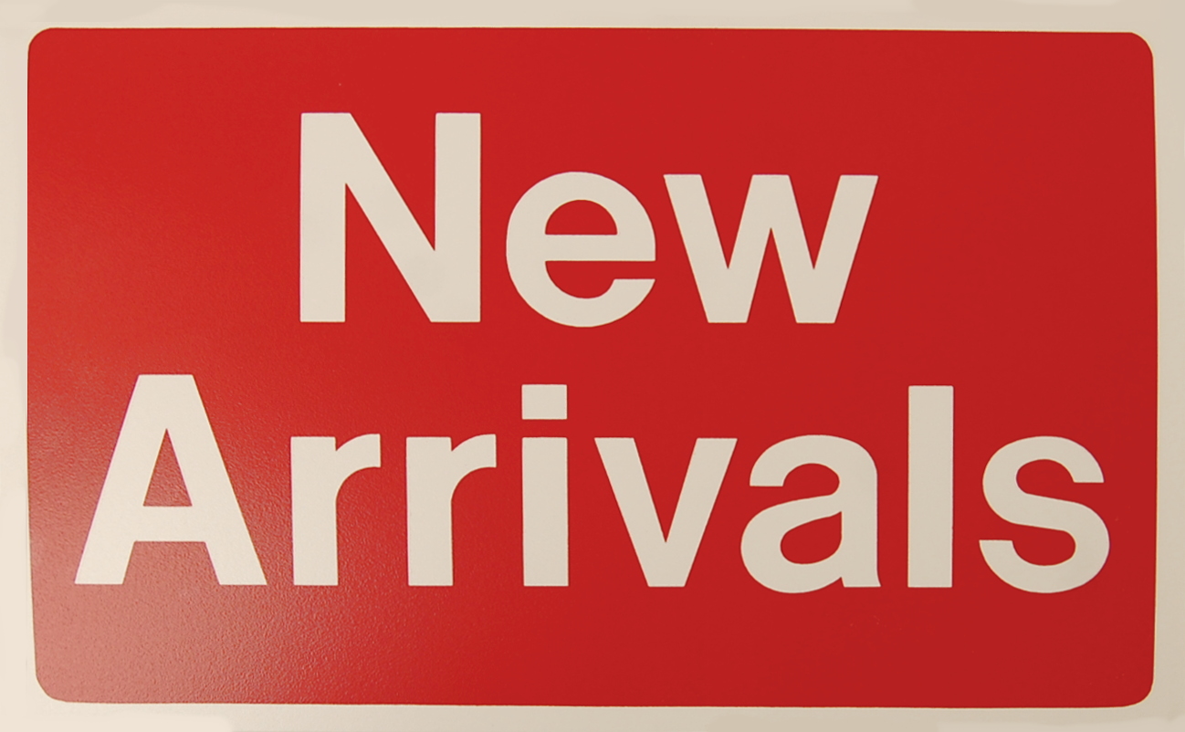 • “NEW ARRIVALS” • 7″ X 11″ PLASTIC RETAIL SIGN • RED AND WHITE COLORS