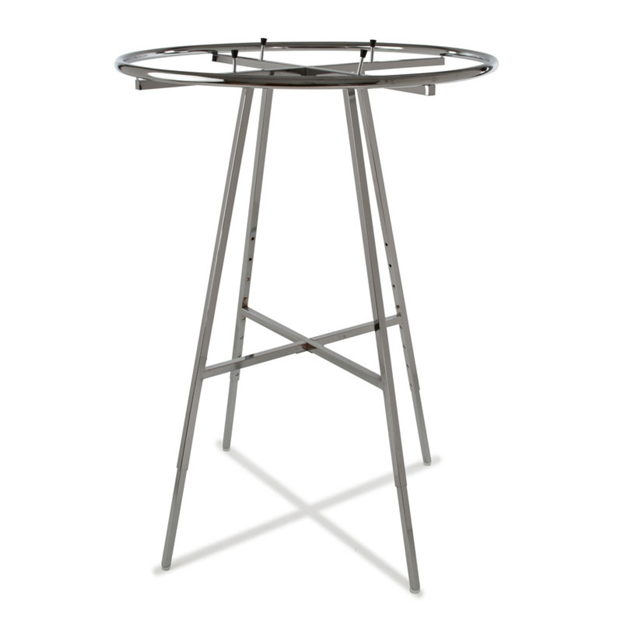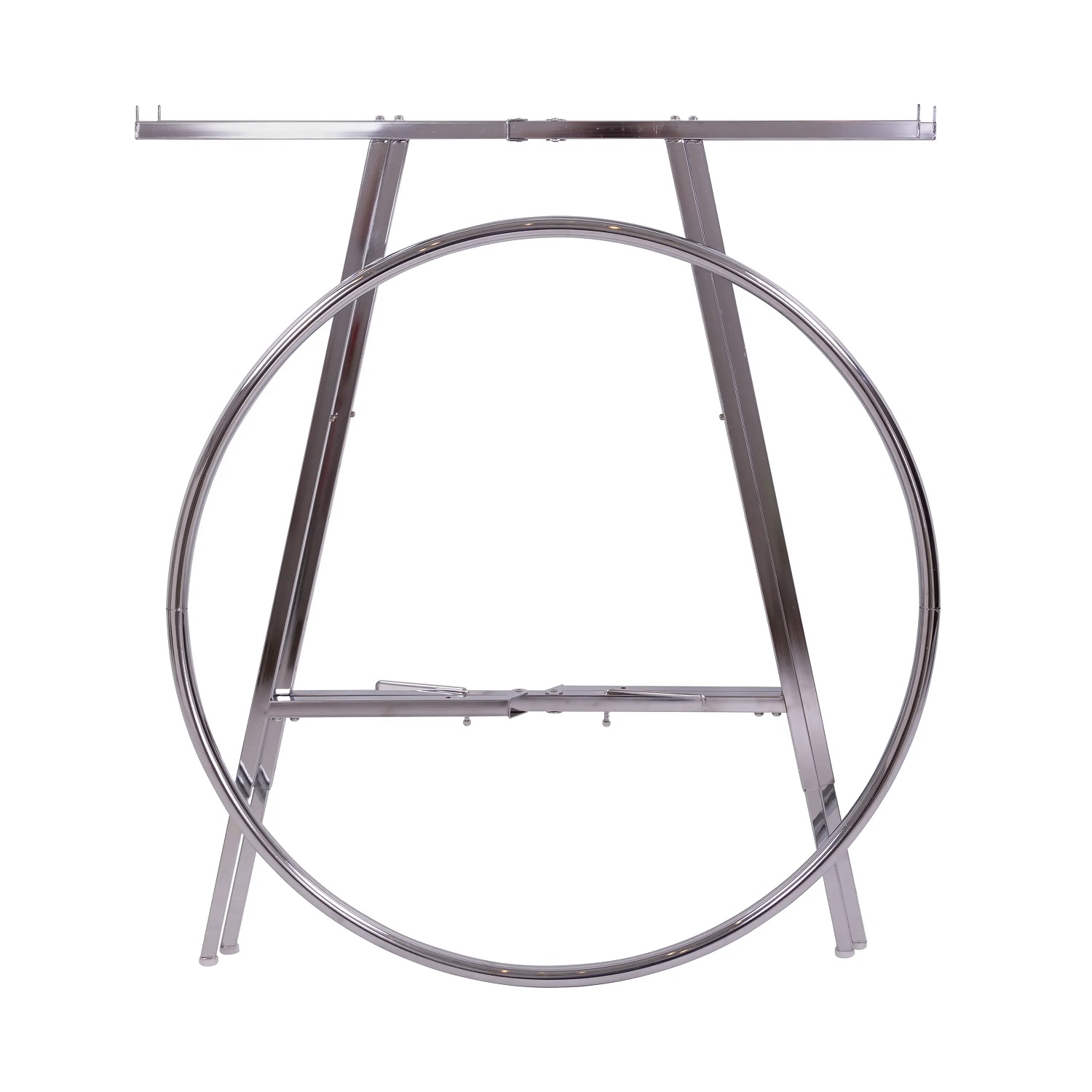 • 1 1/4″ HANG RAIL ROUND • 1″ SQUARE UPRIGHTS • 42″ DIAMETER • ADJUSTABLE HEIGHT EVERY 3″ • HEIGHT ADJUSTS FROM 48″ TO 66″ • FOLDING FRAME • COLOR CHROME