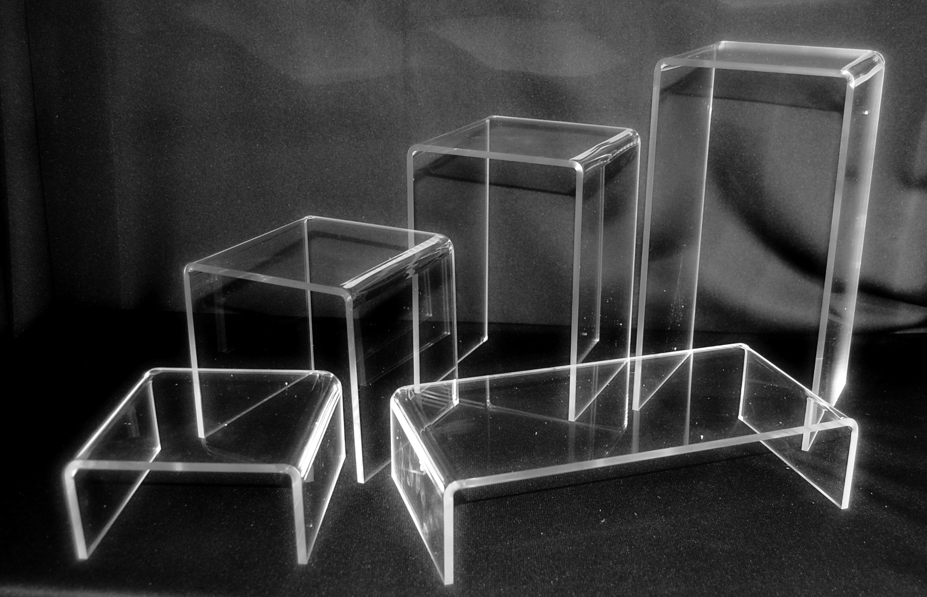 FIVE ACRYLIC RISERS: • 6”X6”X3H” • 6”X6”X9H” • 6”X6”X12H” • 12”X6”X3H” • 6”X6”X6H” • CLEAR 1/4″ ACRYLIC