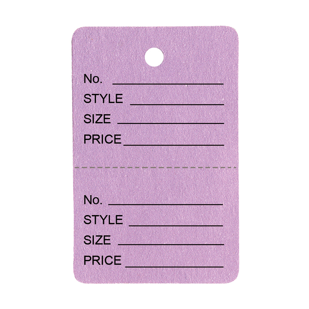 • UNSTRUNG TAG • TEXT-NO. STYLE, SIZE, AND PRICE • COLOR PURPLE • 1 7/8″ X 1 1/4″ SIZE • CASE OF 1000 TAGS